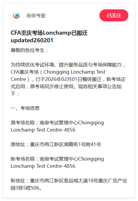 CFA重庆考场(Chongqing Lonchamp Test Centre),已于2026年02月01日整体搬迁,新考场正式启用,原考场同步停止使用。本次搬迁为整体搬迁,考试安排、入场流程、证件要求、考场规则等均保持不变,相关事宜以CFA协会及Prometric官方最新通知为准。